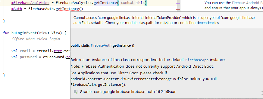 Cannot access 'com.google.firebase.internal.InternalTokenProvider' which is a supertype of 'com.google.firebase.auth.FirebaseAuth'. Check your module classpath for missing or conflicting dependencies